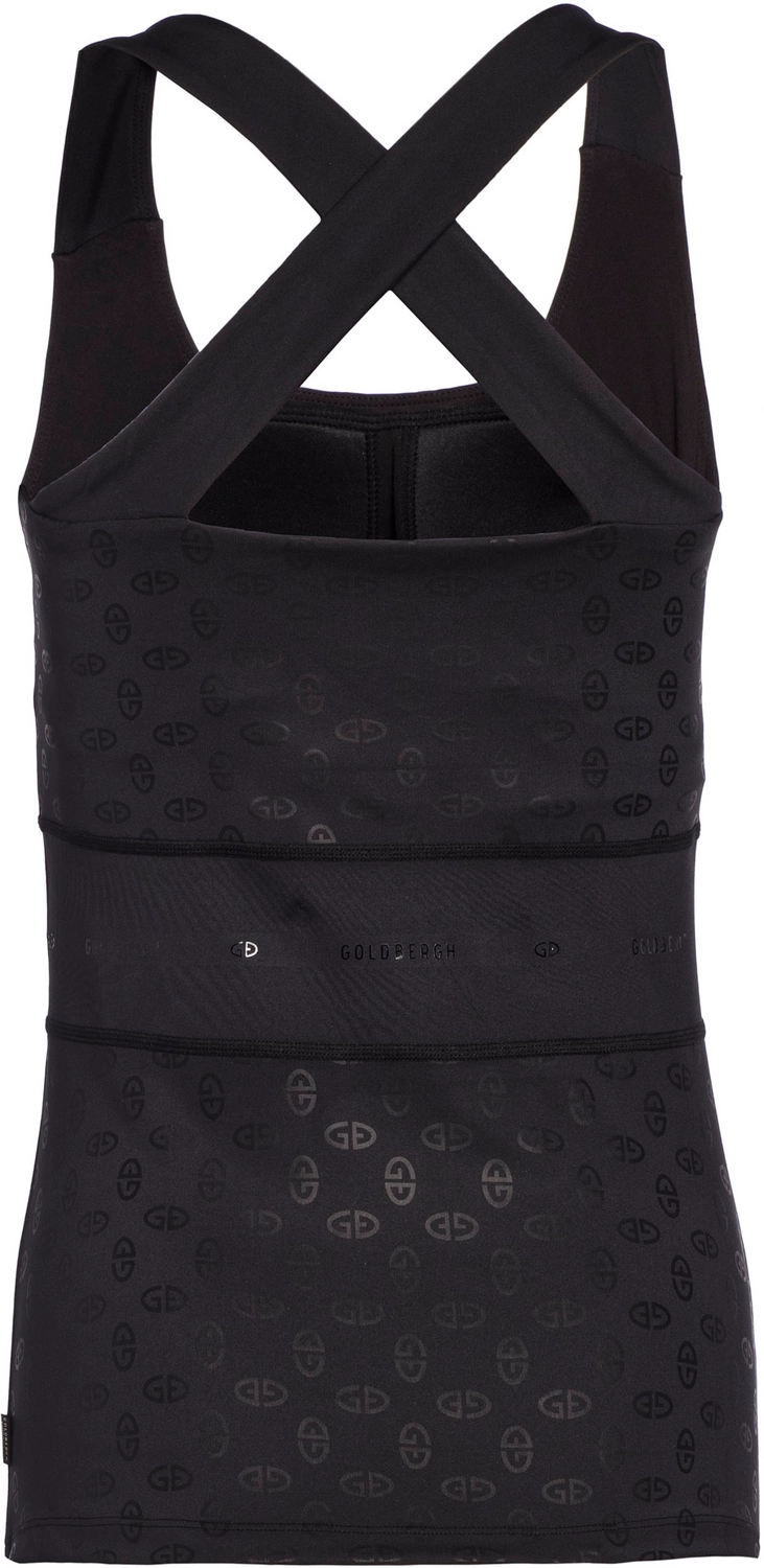 Deze tanktop is afkomstig uit de Destiny serie van het merk Goldbergh. Het materiaal van de Slim Fit tanktop bestaat uit 76% polyester en 24% elastaan, wat zorgt voor een sneldrogende en vochtregulerende stof die vervelende geurtjes voorkomt. Daarnaast is de tanktop voorzien van Powerstretch interlock, stevige bandjes in dezelfde stof en een gekruiste powermesh laag op de rug. Verder heeft de tanktop een binnen BH van jersey met vaste cup en verstelbare elastische bandjes.