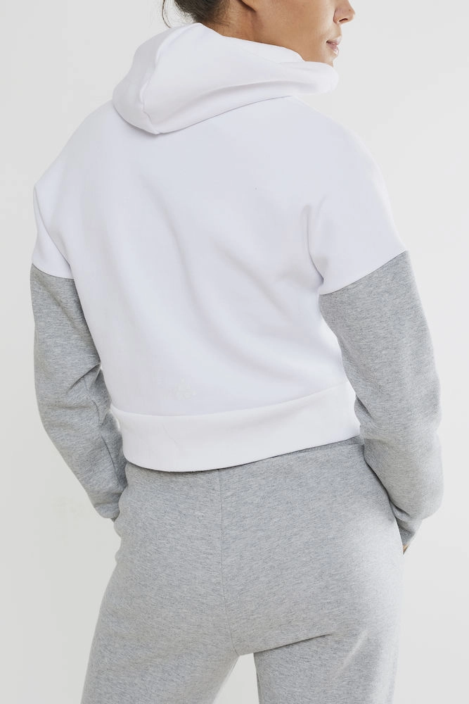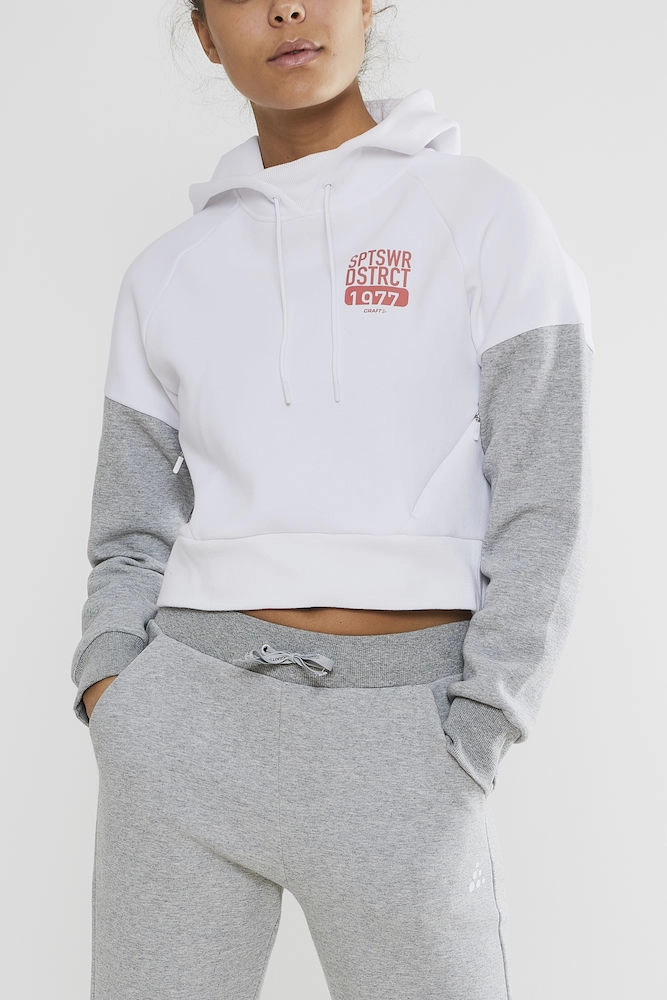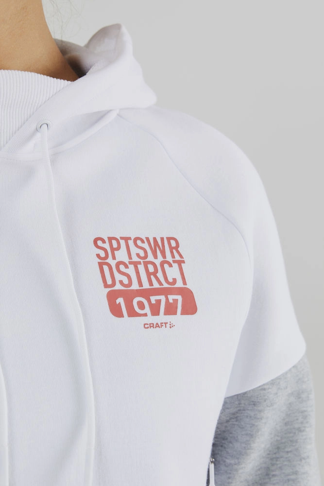 Deze fijne trui is afkomstig van de District serie en is speciaal ontworpen voor vrouwen. De trui is van het populaire merk Craft, wat bekend staat om zijn duurzame goede kwaliteit sportieve kleding. De District trui heeft een fijne capuchon en een hogere kraag, waardoor hij goed de warmte vasthoudt. De mouwen en rand bij de taille heeft een geribbelde look en sluit goed aan op uw lichaam, waardoor het een comfortabele pasvorm heeft! De trui heeft een casual look waardoor hij goed te combineren is met uw andere outfits. De stijlvolle trui heeft een print op de voorzijde, wat hem sportief en modern maakt!